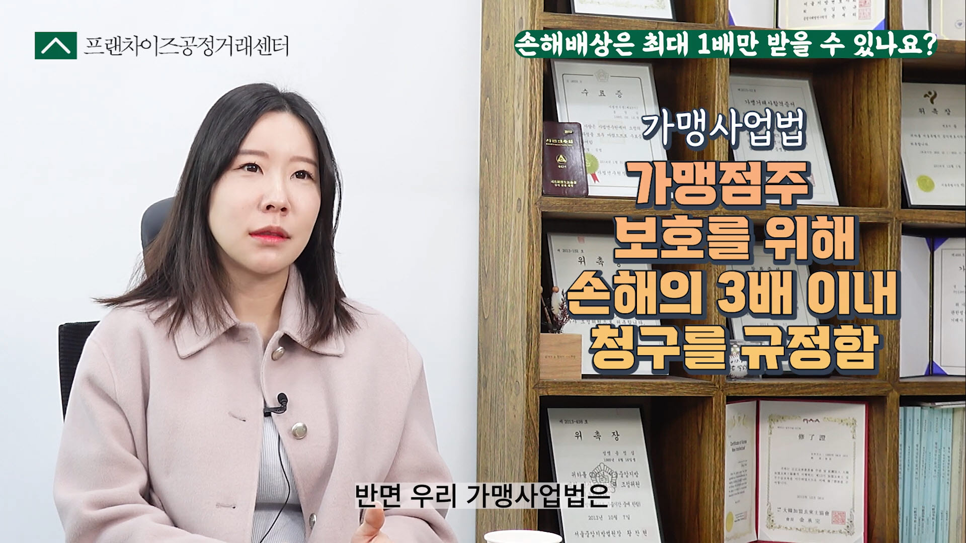 우리 가맹사업법은 가맹점주 보호를 위해 손해의 3배 이내를 청구할 수 있도록 규정하고 있습니다.