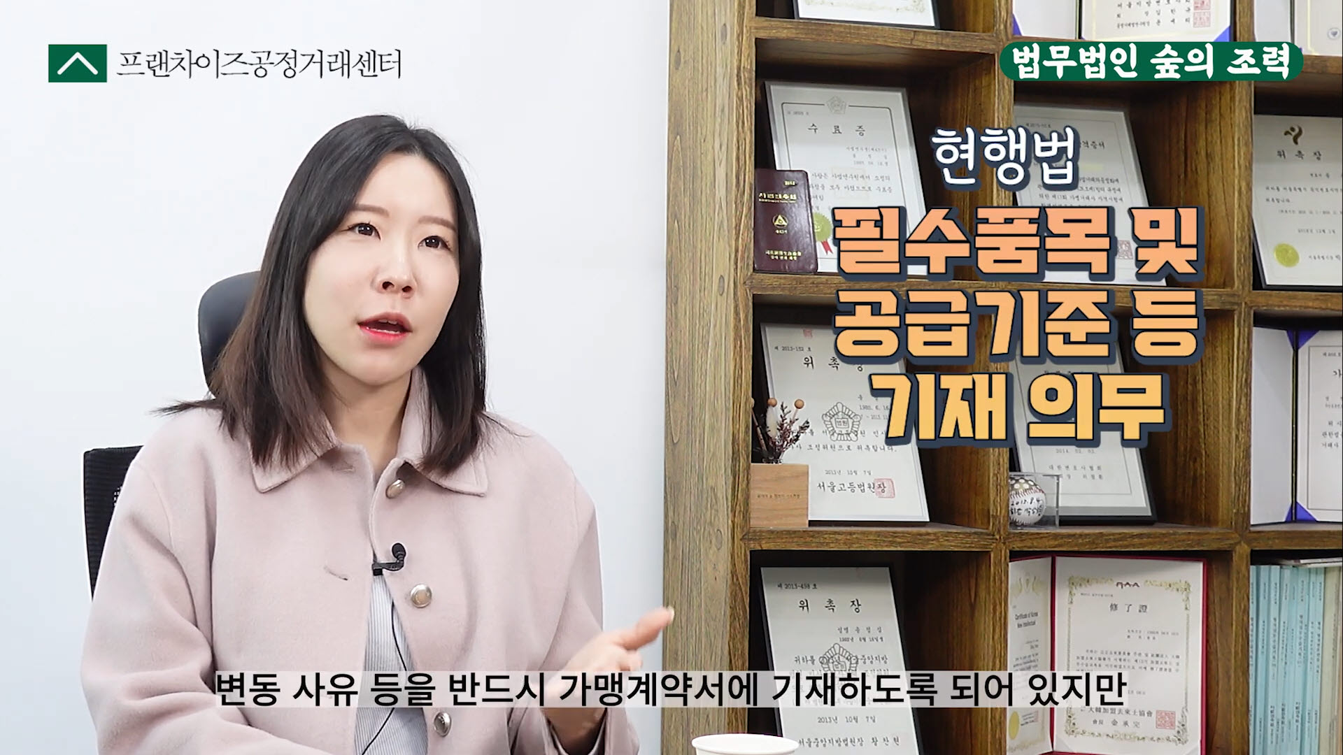 현행법은 필수품목의 종류, 공급기준, 변동사유 등을 반드시 가맹계약서에 기재하도록 되어 있으나, 이 사건은 개정법이 적용되기 전이었던 것입니다.