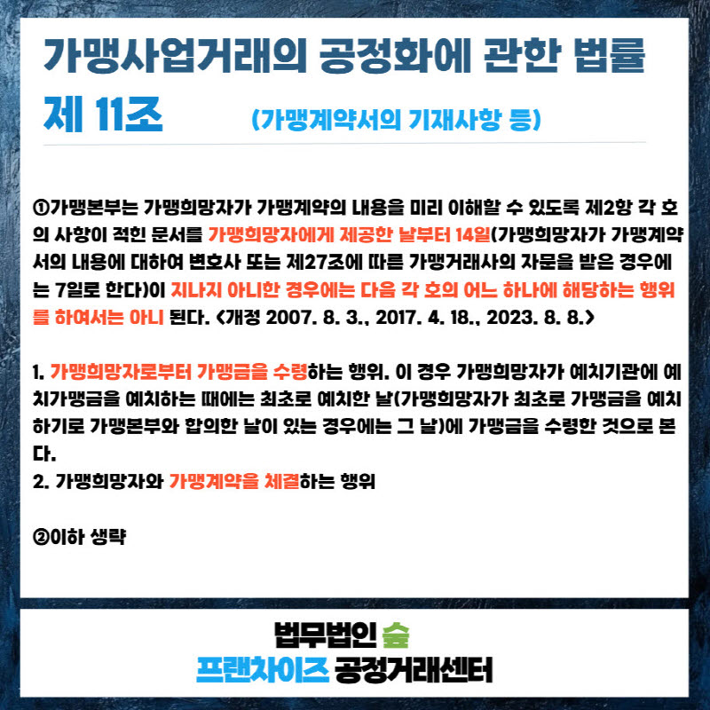안녕하세요, 프랜차이즈 전문 법무법인 숲 송윤 변호사/가맹거래사입니다.